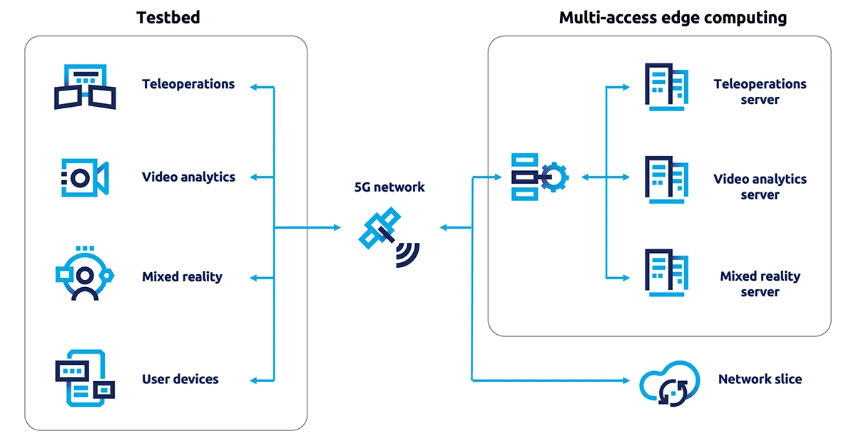 The diagram below shows how the use cases were set up in the 5G testbed and Multi-access Edge Computing (MEC) over a 5G network.