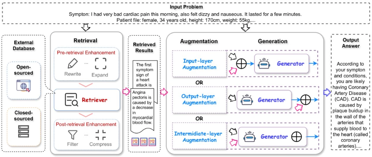 Figure 3. The basic retrieval augmented large language models (RA-LLMs) framework for a specific QA task (Ding, et al., 2024). RAG is continuing to evolve rapidly around 4 areas, namely (1) the RAG Framework/Pipeline, which integrates retrieval mechanisms with generative models to boost the accuracy and relevance of AI-generated outputs; (2) RAG Learning, focused on optimising the interaction between retrieval and generative components through strategic training; (3) Retriever Learning, which involves fine-tuning algorithms to accurately identify and retrieve relevant information from databases; and (4) Pre-/Post-Retrieval Techniques, employed to refine the quality of retrieved data and enhance its effectiveness in generating precise and contextually appropriate AI outputs.