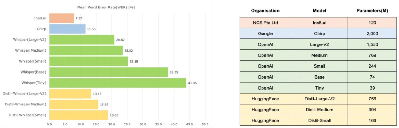 Figure 6. Relative performance of AI systems for speech-to-text (STT) transcription of Singlish. Most globally trending STT engines (such as those from OpenAI and Google) are not optimised for understanding languages and their dialects spoken by small populations and communities. AI models trained with local datasets can perform better with fewer parameters and smaller computational footprint, as this example of Ins8.ai by NCS demonstrates.