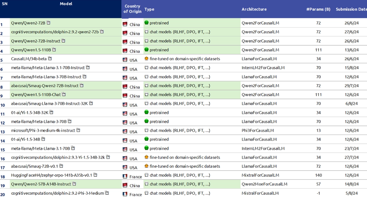 Figure 7. Hugging Face leaderboard of top-ranked open LLMs. The ranking is by the Massive Multitask Language Understanding Pro (MMLU-PRO) benchmark, which is used for evaluating the performance of LLMs on a broader and more challenging set of tasks compared to the original MMLU, designed to test the latest models’ capabilities in handling complex, real-world problems. Alibaba’s 千问 models (abbreviated as Qwen) is highlighted in green. (https://open-llm-leaderboard-blog.static.hf.space/dist/index.html)