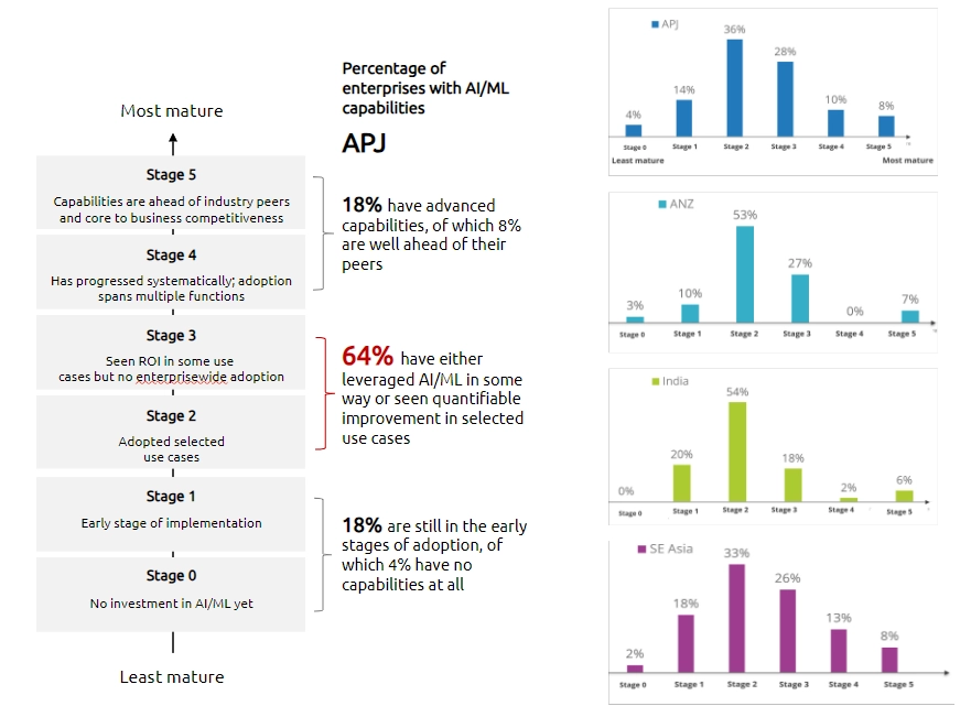 Figure 8. AI maturity in APJ organisations. IDC survey in 2023 shows that the majority of surveyed organisations (82%) are still in early stages of harnessing AI, and have not achieved scaled impact yet. Only a small percentage (4%) have not done anything and are yet to respond to recent advances in AI technology.