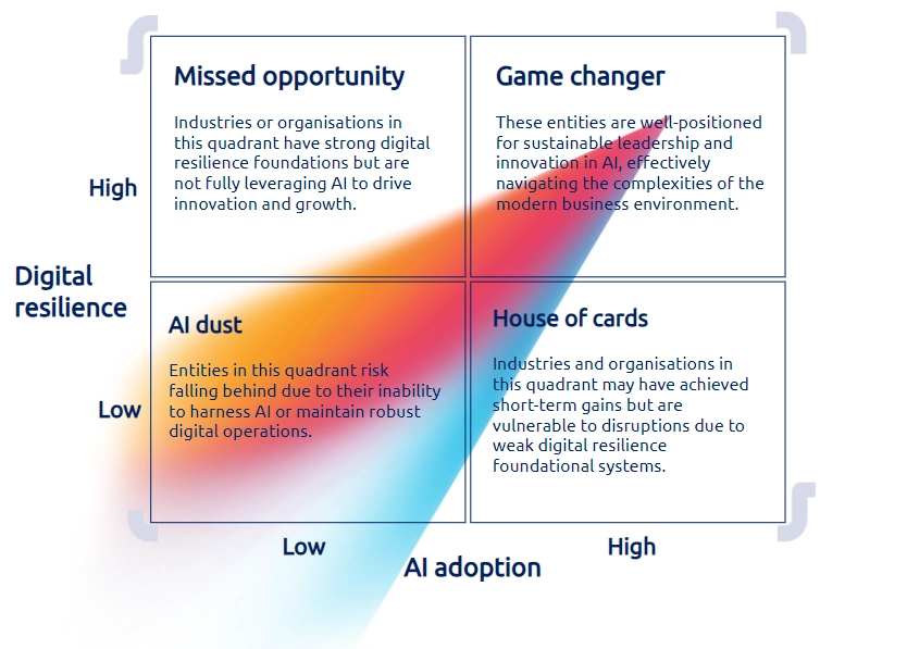 Figure 9. AI+DR matrix. Organisations can use the AI+DR Impact Matrix to engage in strategy discussions, identifying gaps, and prioritising areas for investment not just in AI but also in DR. The matrix serves as a strategic reminder to ensure that as AI adoption increases, corresponding investments in digital resilience are made to maintain stability and security. (NCS, 2024).