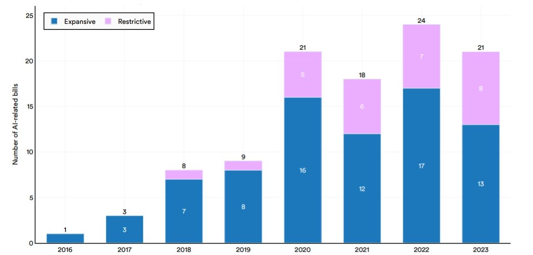 Figure 10. The number of AI-related bills passed into law has seen a dramatic increase since 2019 in the countries studied by Stanford Institute for Human-Centered Artificial Intelligence (HAI) (2023), namely Andorra, Austria, Argentina, Belgium, France, Hungary, Italy, Kazakhstan, Luxembourg, Portugal, Russia, South Korea, Spain, United Kingdom and United States. Expansive bills enhance a nation’s AI capabilities while restrictive bills impose limitations on AI usage.