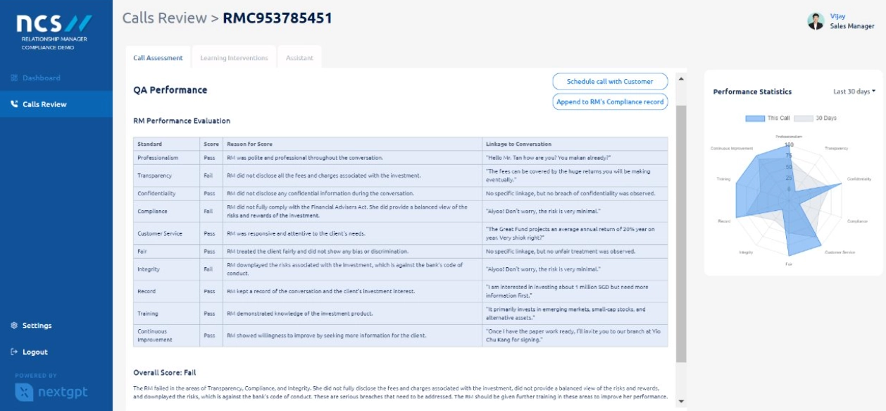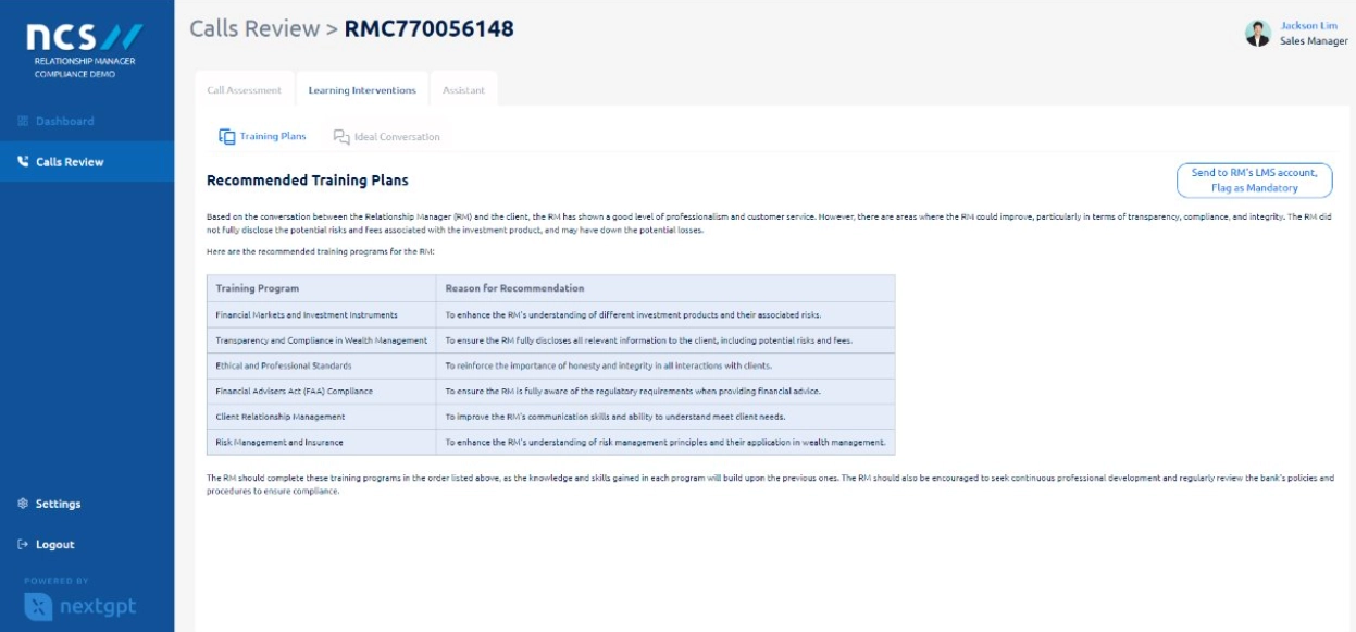 Leveraging advanced language models and automated hyperlocal speech recognition, NCS developed the Compliance AI Assistant to enable real-time monitoring, actionable insights, and enhanced performance management. This innovative solution addresses the problem statement “Is my Relationship Manager compliant with both internal and external regulatory policies and guidelines?’ and utilises real-world conversations, bank policies, ethical guidelines, and regulations (such as those of the Financial Advisers Act/MAS, in Singapore) as inputs. By combining these inputs with the power of GenAI, the Compliance AI Assistant provides real-time alerts on non-compliance, generates comprehensive reports, and facilitates targeted training plans for RMs, enabling a holistic view of RM performance (Refer to Figures 2 and 3).