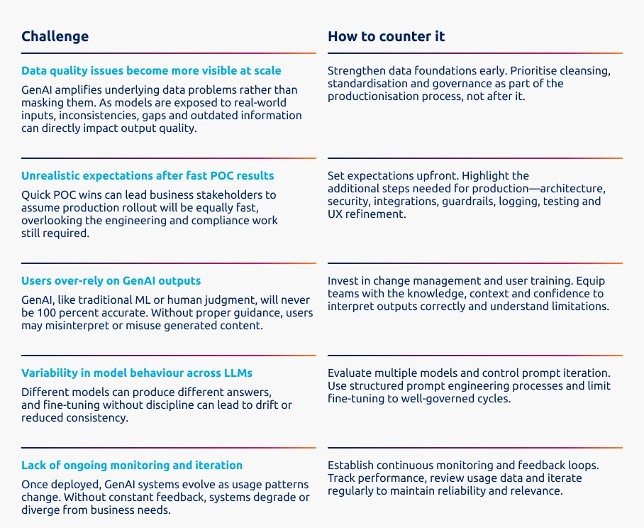 While POCs demonstrate what GenAI can do, production requires deeper rigour. These are the most common challenges teams encounter when making that shift.