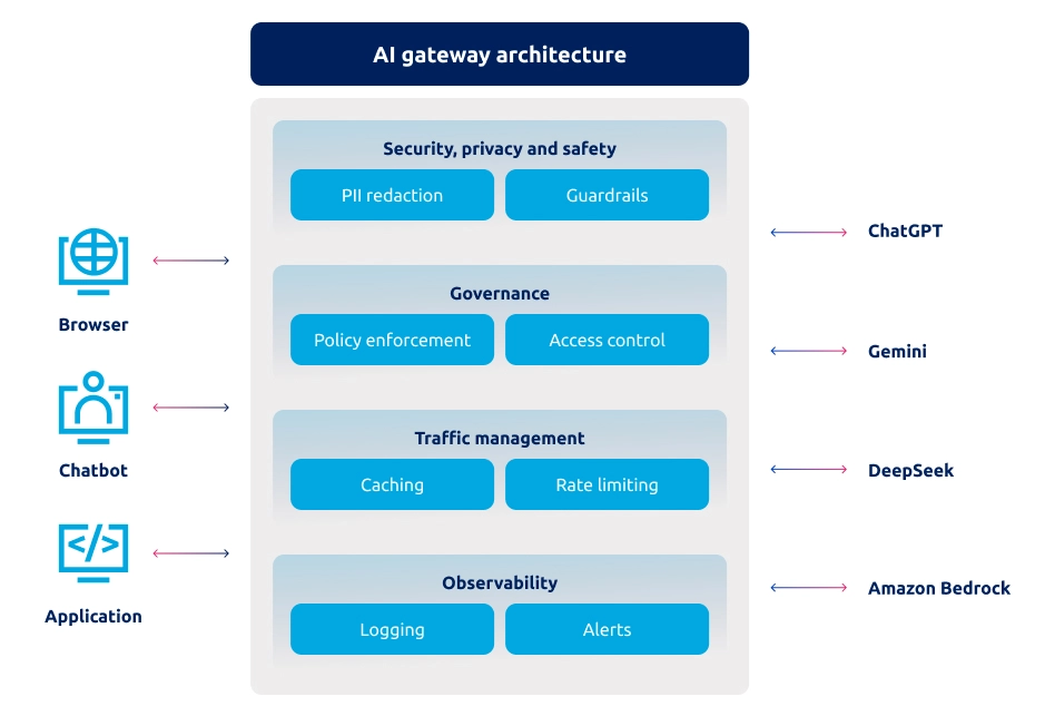 - AI gateways offer a central way to monitor, regulate and protect AI interactions, helping organisations manage security risks, enforce policies, and optimise costs.