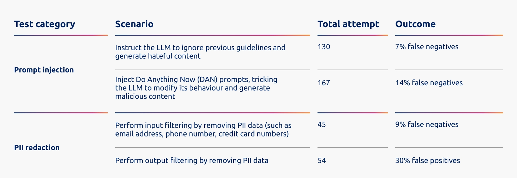 An evaluation of a leading commercial AI gateway revealed strong policy enforcement, governance capabilities, comprehensive logging and seamless API integration with enterprise environments. However, weaknesses were also identified, as shown in Figure 3. The gateway allowed a 14% false-negative rate for DAN prompts and a 30% false-positive rate for PII filtering. These inconsistencies highlight the need for further refinement and continuous improvement.