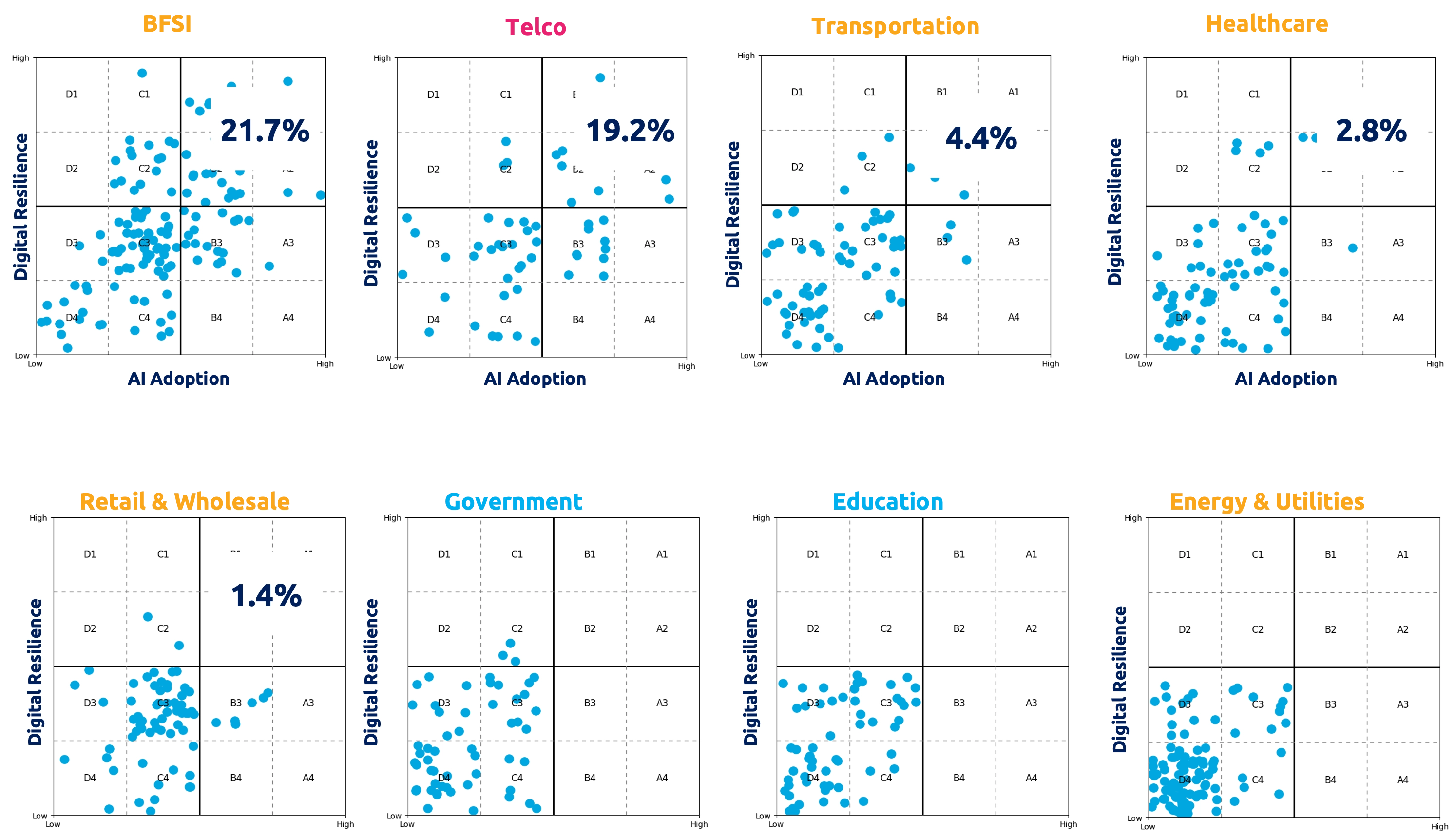 Figure 4. AI+DR Matrix across leading industries. BFSI emerges as the clear leader, with 21.7% of organisations demonstrating high AI adoption and DR readiness. Meanwhile, sectors like Retail & Wholesale (1.4%) remain at the lower end, indicating a need for foundational investments to unlock AI's transformative potential.