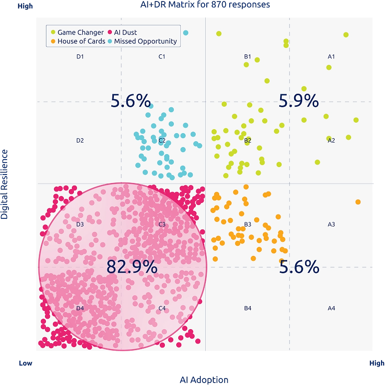 Figure 3. AI+DR Matrix (n=870). The AI+DR Matrix divides organisations into four quadrants: 'Game Changers' (6%) demonstrate high AI adoption and DR readiness, realising substantial business value. Conversely, 'AI Dust' (82.9%)—organisations with low maturity in both areas—struggle to scale AI effectively. The remaining groups, 'House of Cards' (5.6%) and 'Missed Opportunity' (5.6%), indicate partial strengths but face gaps that limit their AI potential.