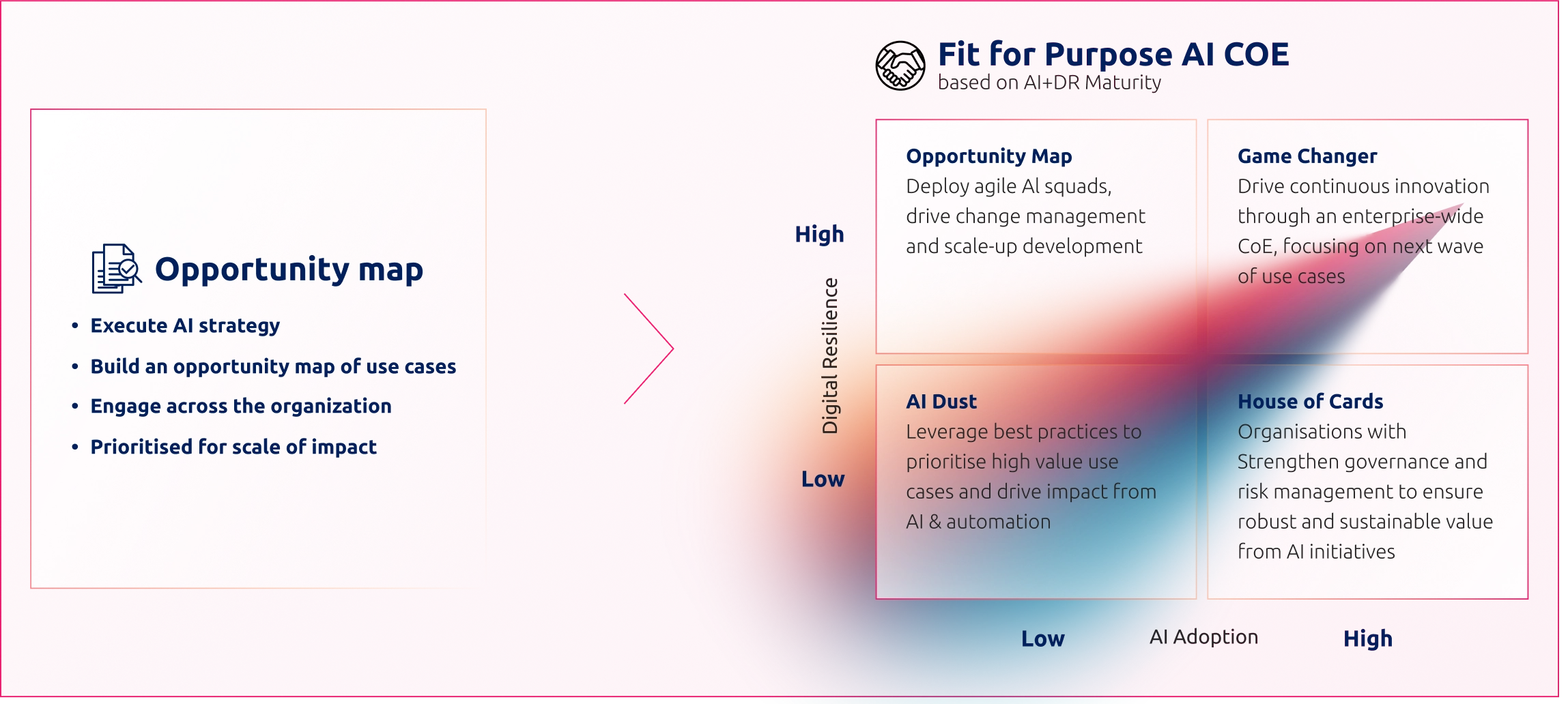 The AI COE acts as the central hub for governance, talent, and best practices. It orchestrates initiatives across the organisation, ensuring lessons learned are captured and reapplied, and that maturity stages are navigated smoothly From establishing guardrails to enabling cross-functional collaboration, the COE provides the structure and adaptability needed to embed AI into the organisation’s DNA. |