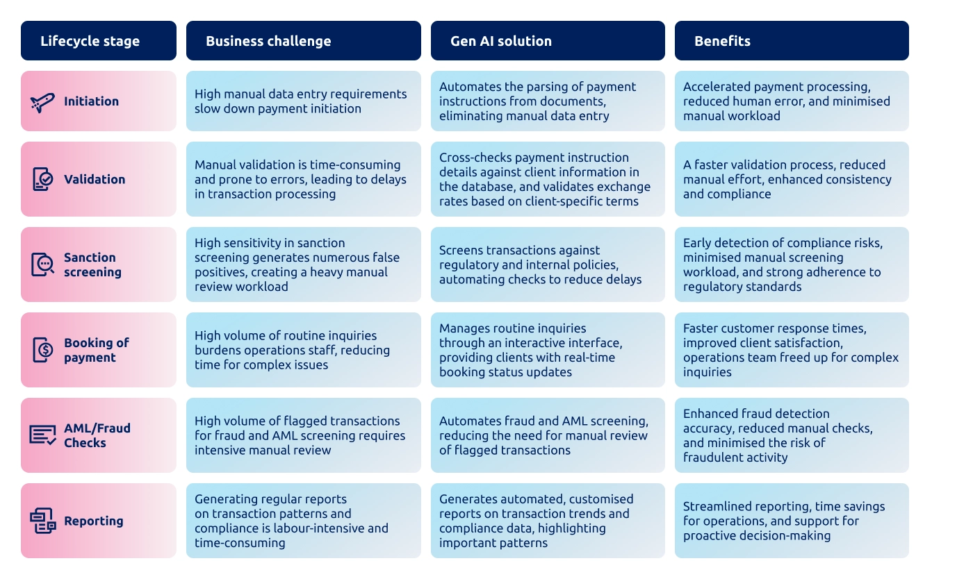 - Generative AI enables more context-aware validation, screening, and reporting across the payments lifecycle.