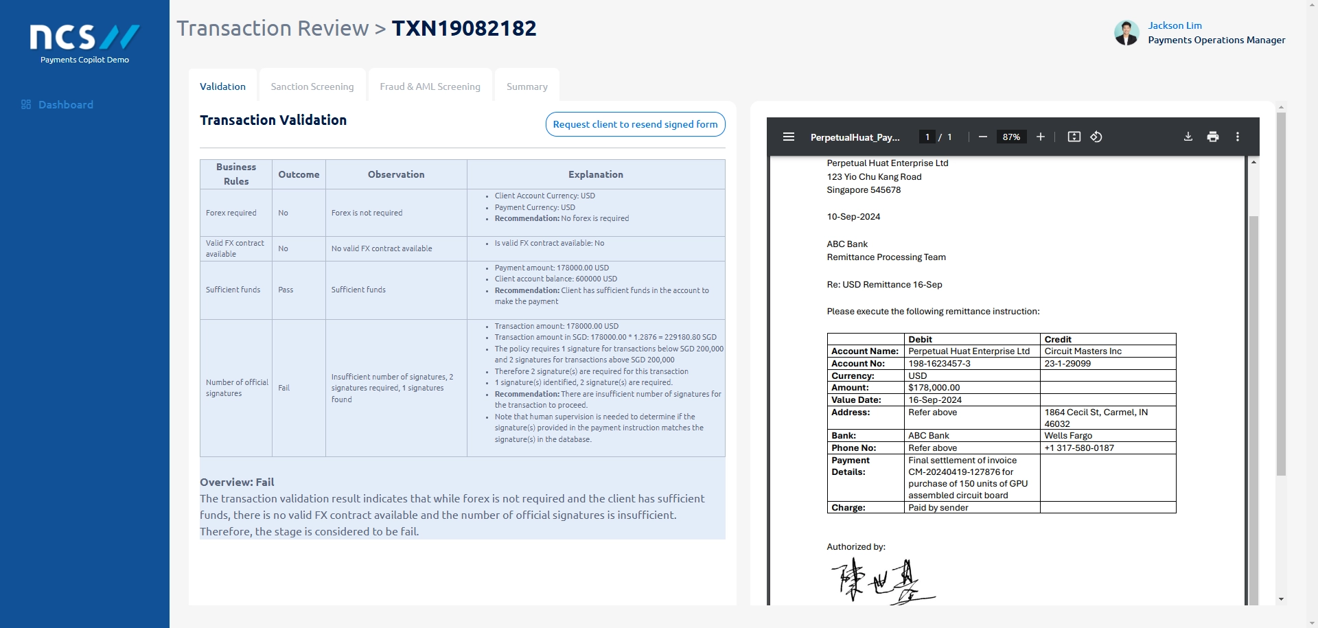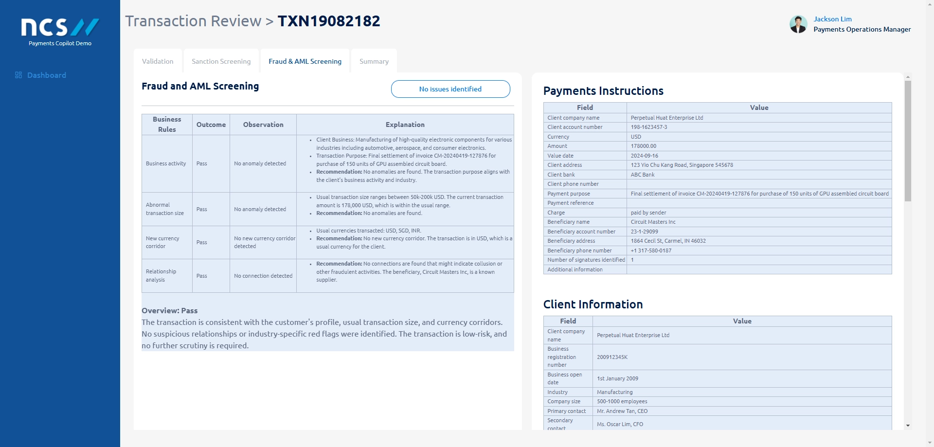 Figure 2: Side-by-side display of screening result and payment instruction in the Transaction Validation stage for easy reference and context.