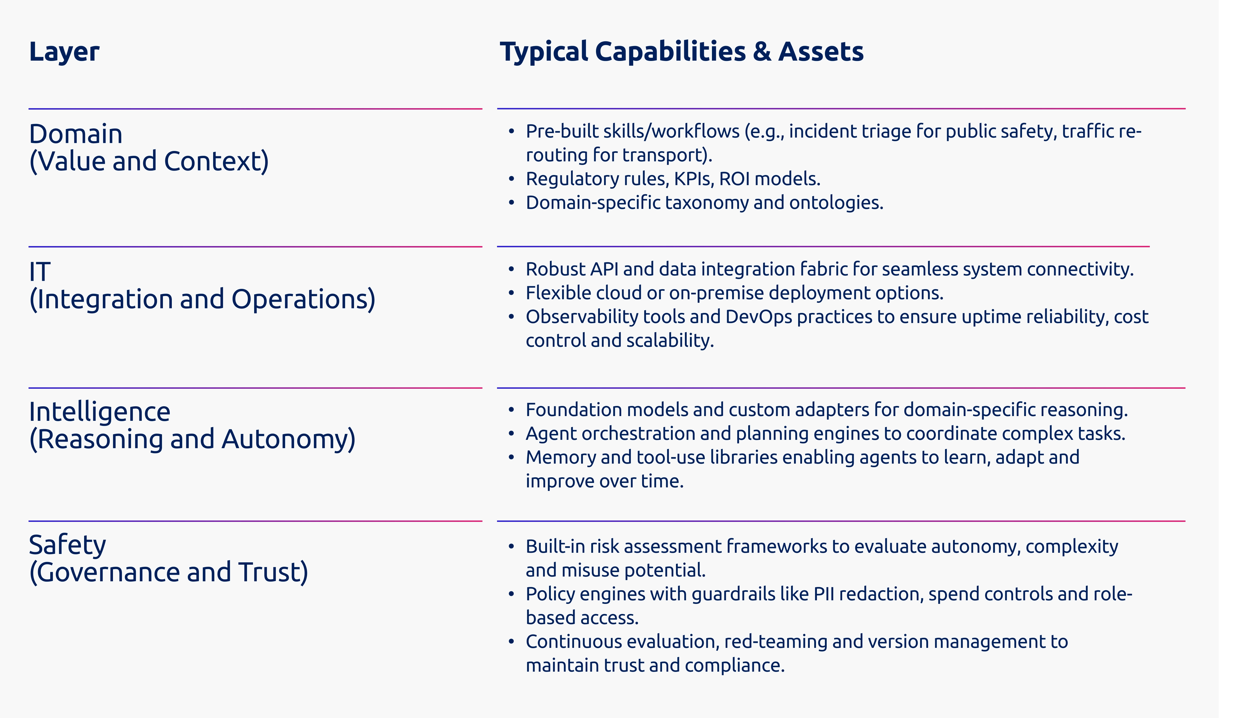 Agentic AI only delivers lasting value when its technical blocks map cleanly to business responsibilities. NCS AgentCanvas is designed with four interlocking layers: Domain, IT, Intelligence and Safety. Together, they create intelligent systems capable of acting autonomously while staying fully governed and aligned to your needs.