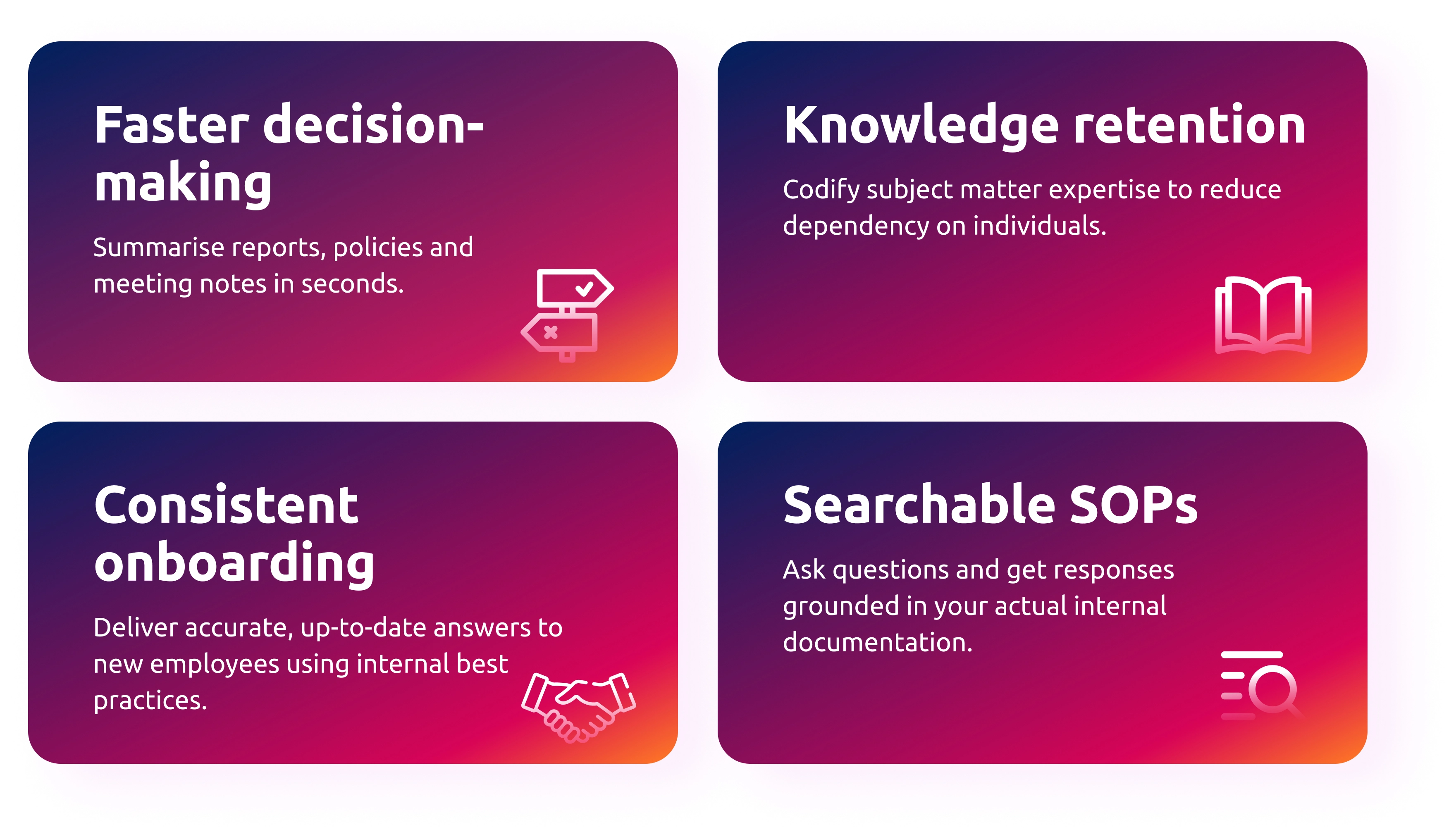 Whether you want to summarise reports, surface internal policies or onboard new hires faster, the platform adapts to your workflows. Start with standalone features or integrate with enterprise systems when you’re ready.