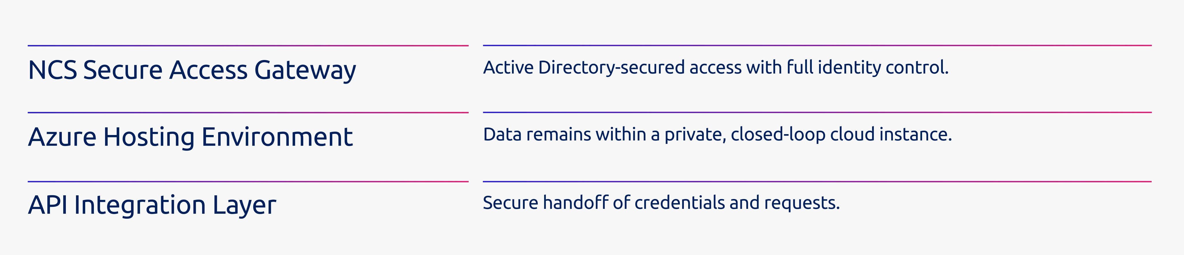 - Secure file interaction: Upload documents without leaving the secure NCS environment.