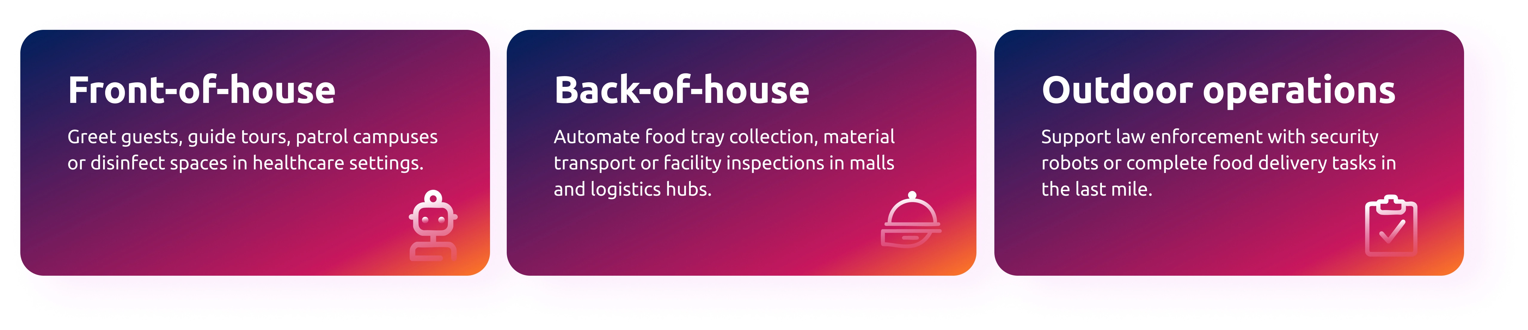 Choose from a range of specialised robots for hospitals, schools, malls, museums, warehouses and more. - Integrate with intelligence