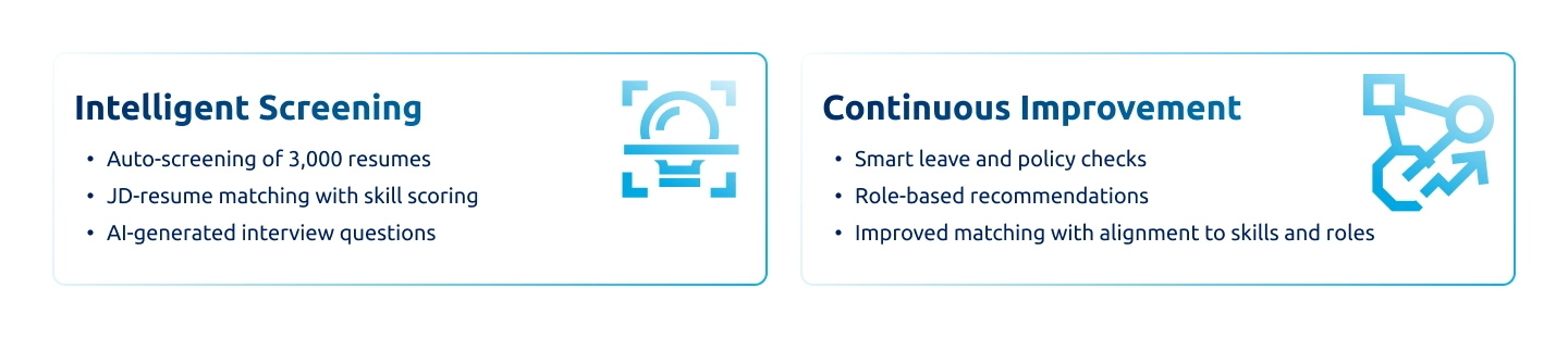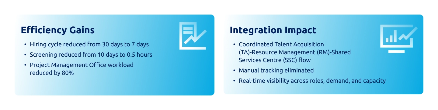 - Hiring cycles reduced from 30 days to 7, with screening time cut from 10 days to under an hour, a 90% efficiency gain.