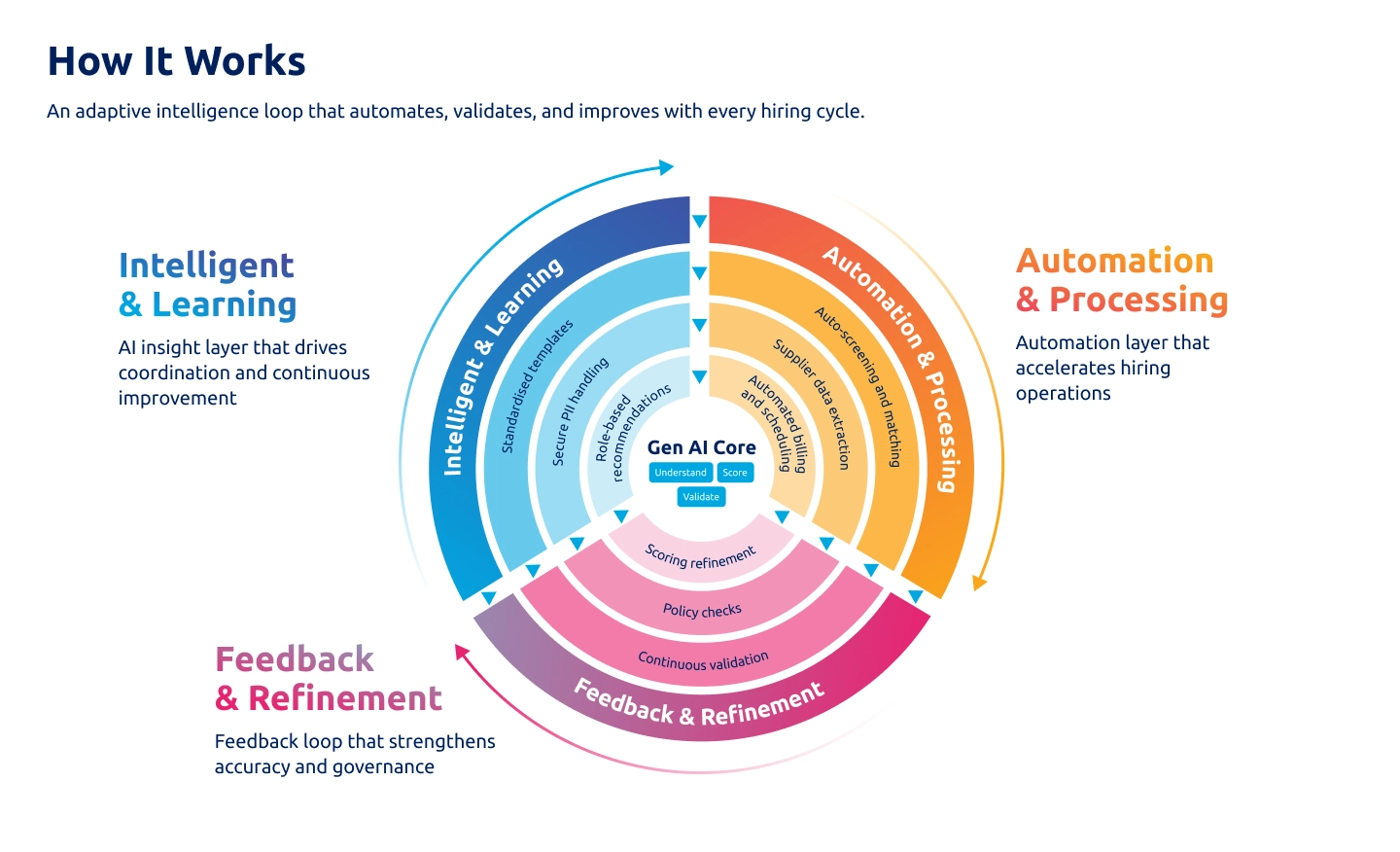 At the core of the platform is a GenAI engine that connects previously siloed HR functions – talent acquisition, resource management, and shared services – into an adaptive intelligence loop that automates, validates, and improves with every hiring cycle.