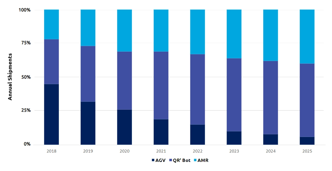 The need for adaptive solutions that can handle dynamic environments has led to a paradigm shift towards robotic systems with increased autonomy and the capability to thrive in unpredictable settings. This shift is most evident in the rise in popularity of autonomous mobile robots (AMRs) over automated guided vehicles (AGVs) that normally operate on fixed routes and have difficulty adjusting to changing environments. According to The Robot Report[1], it is forecasted that 50% of all mobile robot shipments will be AMRs and less than 25% will be AGVs by 2025.