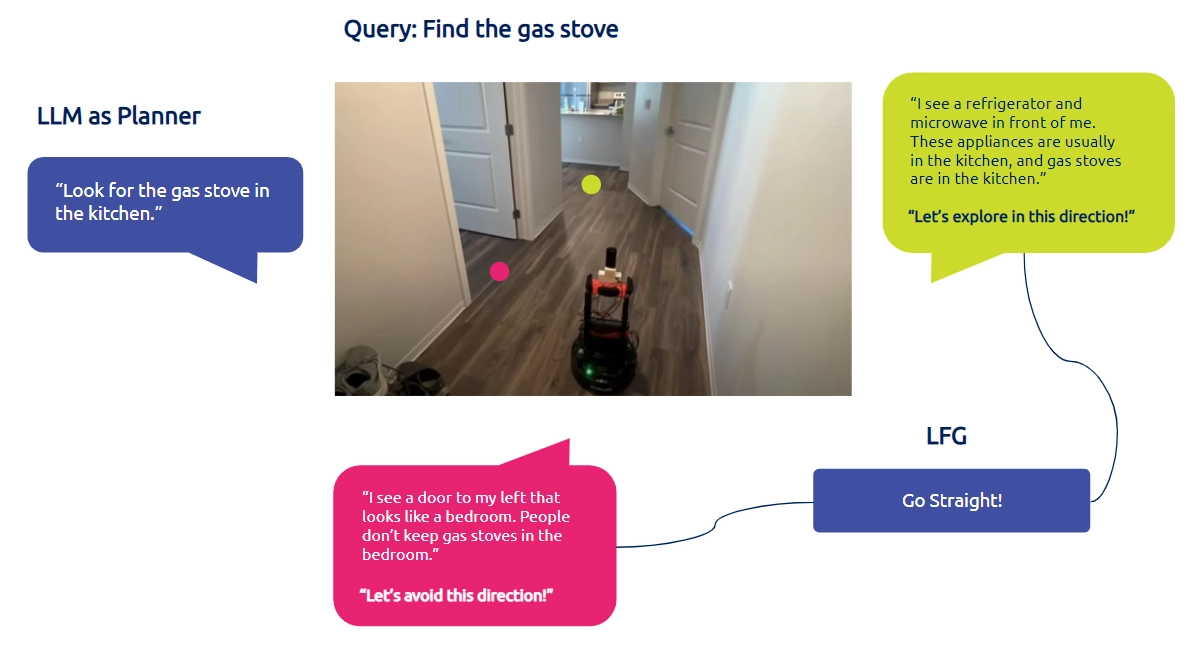 The LLM directing the robot towards the refrigerator and microwave as it has higher likelihood of finding the gas stove nearby. Source: https://sites.google.com/view/lfg-nav/