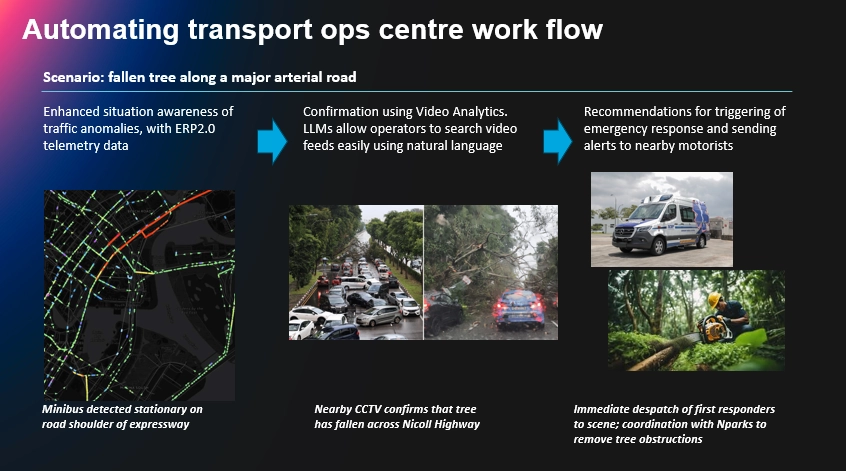 Figure 4. Agentic AI can automate responses to unexpected traffic incidents, like a fallen tree blocking a major road. By integrating real-time telemetry data, video analytics, and natural language search capabilities, the system enables rapid confirmation of incidents and coordinated emergency responses. From identifying stationary vehicles to dispatching first responders and alerting nearby motorists, agentic AI streamlines the workflow, reducing response times and enhancing road safety. The faster response enabled by agentic AI will save lives.